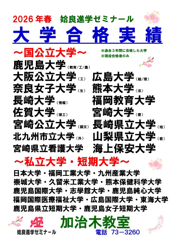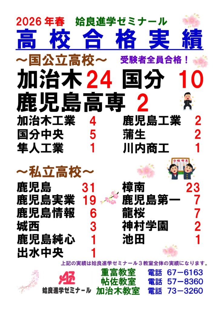 ここでは、姶良進学ゼミナールを卒業した生徒の合格速報をお伝えします。